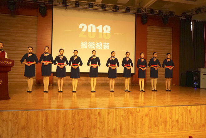 为了培养学生穿着制服的习惯、了解制服穿戴的规范、进一步塑造航空服务型人才应有的形象、增进学生对学校对行业的归属感和责任感,11月30日上午,2018秋季航空服务专业全体学生整齐列队,一场隆重的授装装仪式正在大学生活动中心举行。大会在播放生活短片的轻松氛围中进行,紧接着在雄壮的义勇军进行曲中授装仪式的大幕正式拉开,全体同学精神振奋,激情高涨。首先由礼仪老师周慧老师为同学们讲解制服规范及着装标准,同学们也从中学习到了不少知识。接下来,就开始进行最重要的授装环节,由刘金松老师、王芸芸老师率先为女生授装、由宋修建老师以及周惠老师为男生授装。